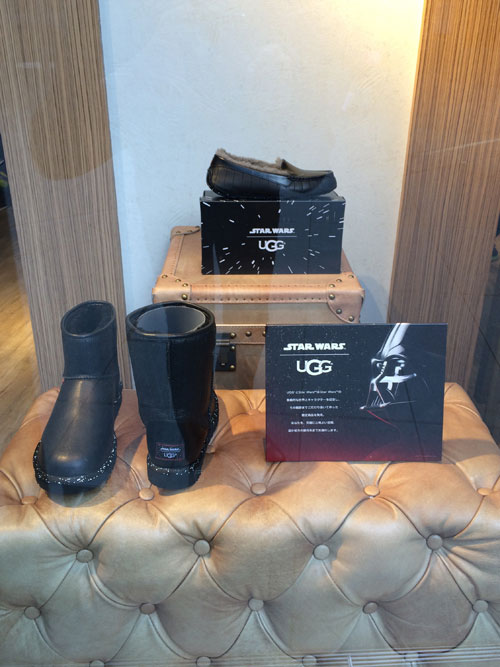六本木駅を降りた瞬間からスター・ウォーズ展の大きなポスターが歓迎。六本木ヒルズ全体から遠い銀河系の彼方へと期待感を高めてくれます。 まず、デススターの内部のような長いエスカレーターを上がって歩くとオーストラリアの靴メーカーUGGとSTAR WARSコラボのダース・ヴェイダーのブーツが目に飛び込んできました。 上質な革を使用しているのでしょう。値段に負けない高級感でいっぱいです。これから蒸暑い季節へ向かう日本にあって、靴の中のファーがトーントーンがいる惑星ホスへ行きたいと思わせてくれました。